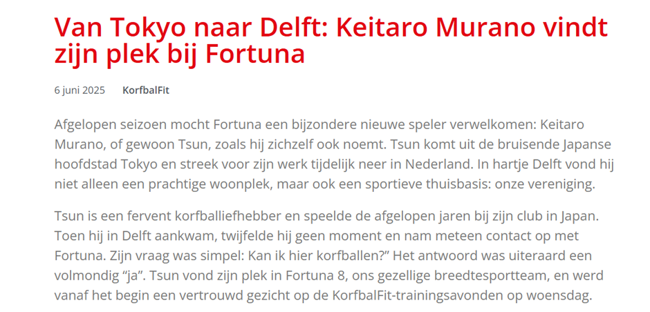 オランダのコーフボールクラブFortunaにてプレー中の協会会員である村野慶多郎さんが、現地クラブの記事に掲載されました。オランダに渡航後、現地のコーフボールクラブで熱心に活動する様子が取り上げられています。